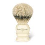 Un elegante pennello da barba prodotto in Inghilterra e rifinito a mano con setole di puro tasso di qualità Silver Tip. L’impugnatura è realizzata in poliestere di colore avorio. Quando conservato con cura ed attenzione, la qualità di questo pennello assicura una lussuosa rasatura per molti anni.