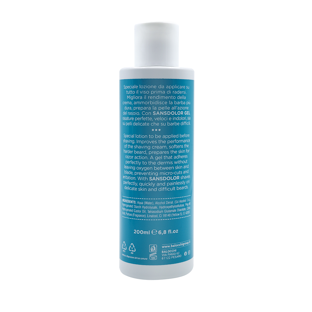 Modo d’uso: inumidire il viso e applicare Sansdolor Gel prebarba.