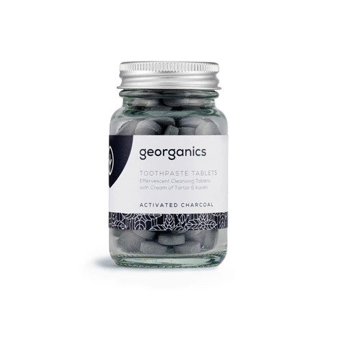 120 pastiglie di dentifricio naturali, senza ingredienti sintetici e prive plastiche nell’imballo, con polvere di carbone attivo.