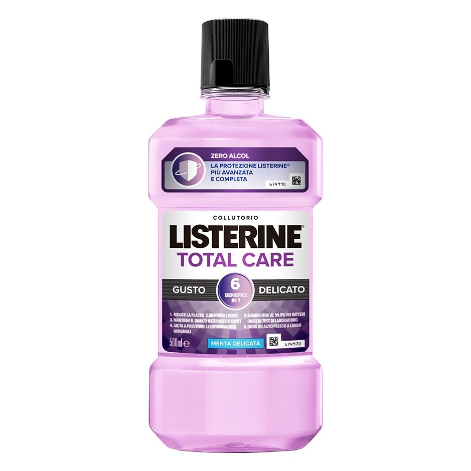 La protezione LISTERINE® più avanzata e completa per un’igiene orale totale. Grazie all’azione combinata degli oli essenziali con il fluoruro e il cloruro di zinco, LISTERINE® Total Care Gusto Delicato dona una pulizia profonda e una protezione totale, offrendo 6 benefici per un’igiene orale completa.
