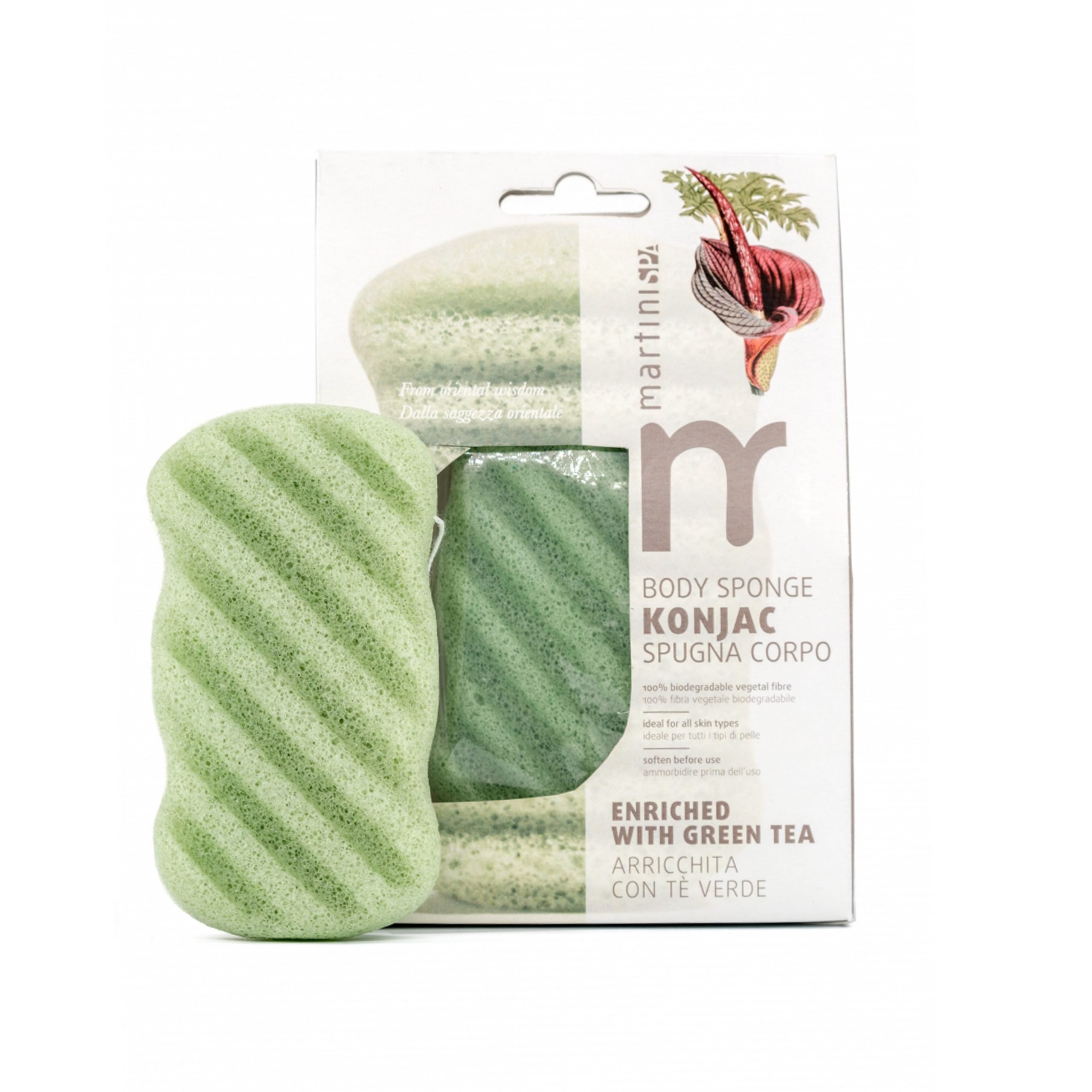 100% vegetale puro konjac asiatico arricchito con tè verde per una pulizia profonda e naturale.