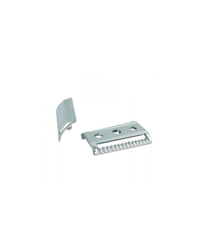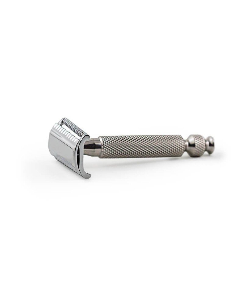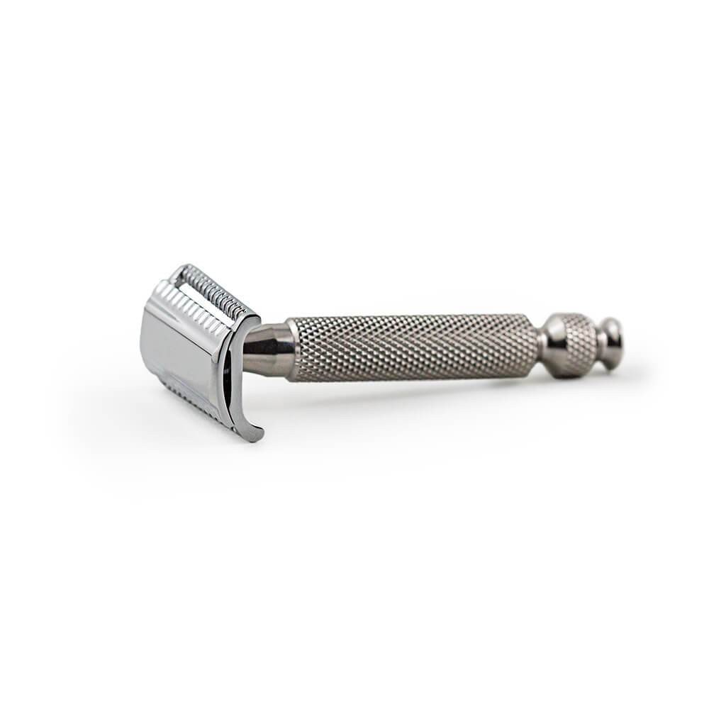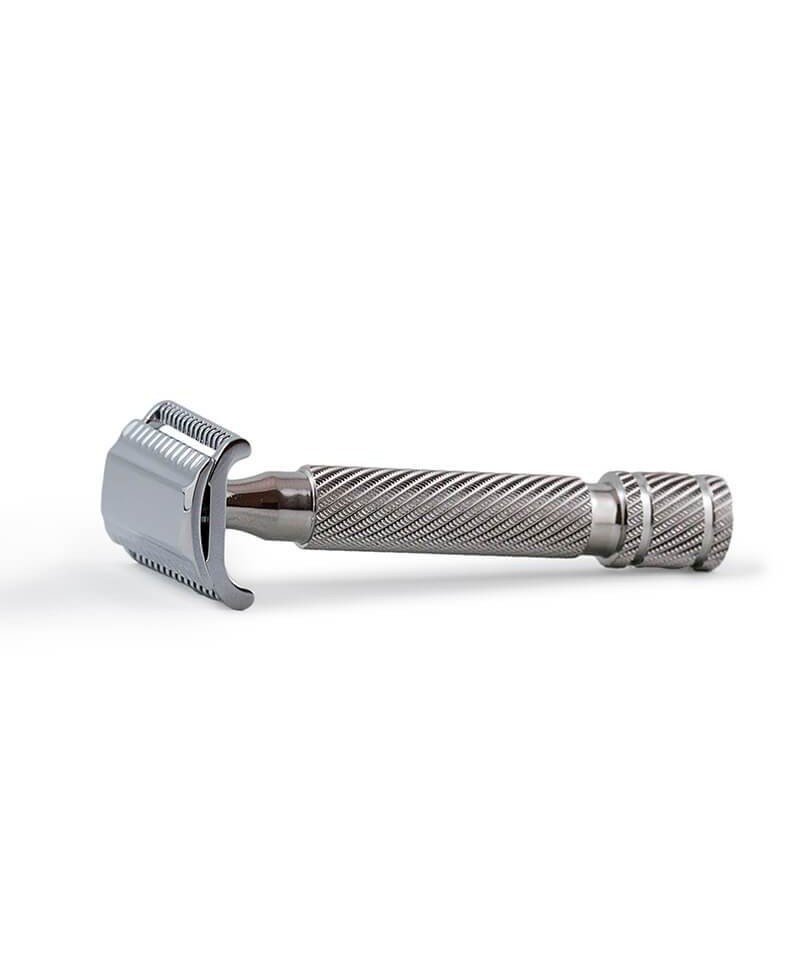 In tre pezzi con testina in alluminio zincato e cromato e manico tipo “barber pole” in acciaio inox 316L lavorato con macchine a controllo numerico di alta precisione. RazoRock ha progettato questo rasoio di sicurezza per chi cerca una rasatura più aggressiva e profonda del semplice Double Edge. La testina Slant tende la lama in due direzioni accrescendone la resistenza meccanica e la rigidità.