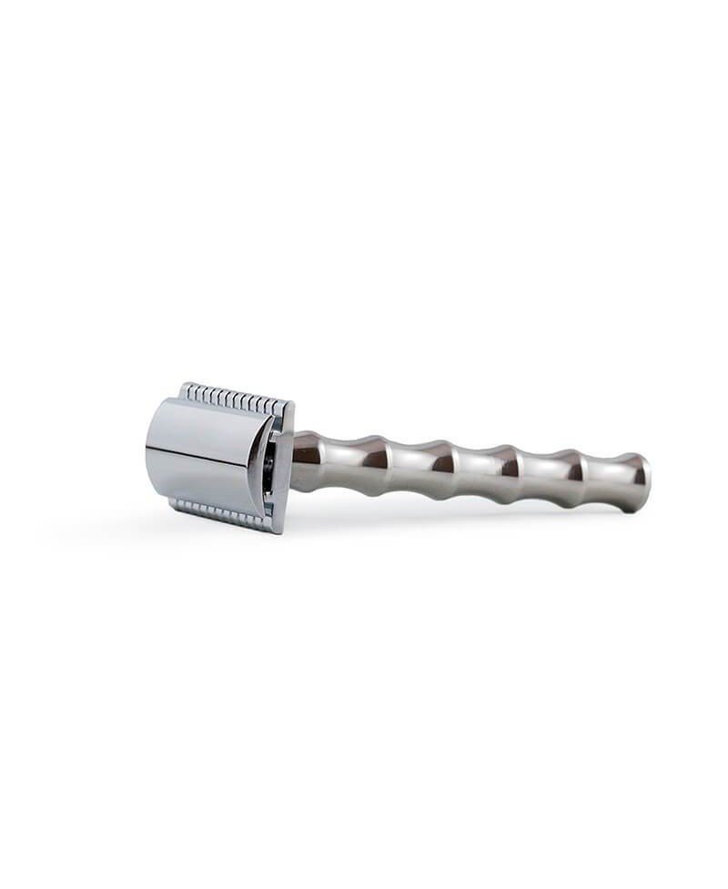 La particolare testa in alluminio zincato e cromato è abbinata al solido manico in acciaio inox 303 lavorato con macchine ad alta precisione, in grado di creare una vera zigrinatura e dunque una grande aderenza anche con mani bagnate o insaponate.