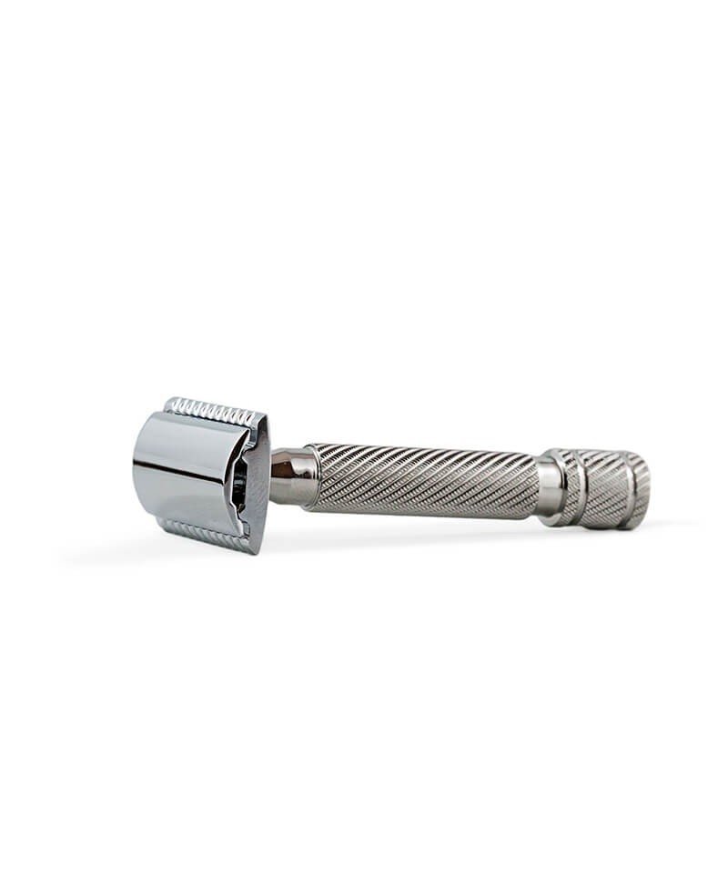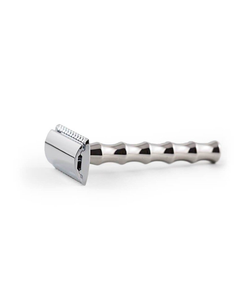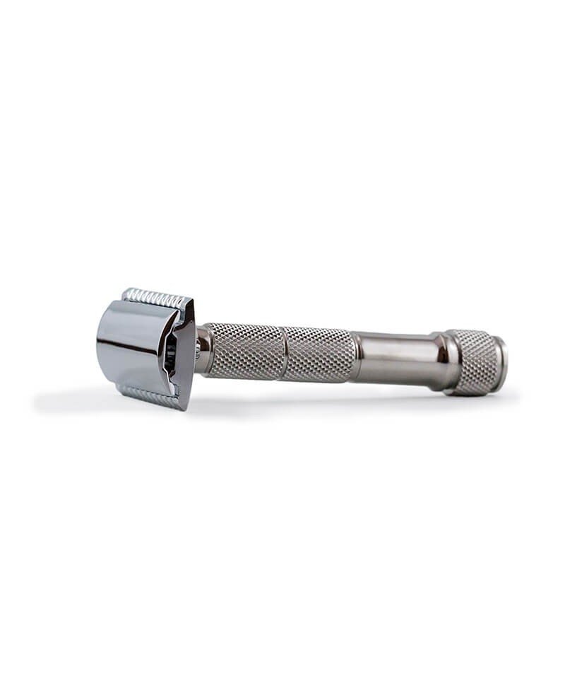 Il manico in acciaio inossidabile garantisce una maggiore robustezza e la precisa lavorazione a macchina CNC con zigrinature assicura un’aderenza perfetta durante la rasatura, in caso di mani bagnate o insaponate. Non è da meno la testa “close comb”, in alluminio zincato e cromato, finemente lavorata, adatta ad una rasatura quotidiana, con finitura molto curata