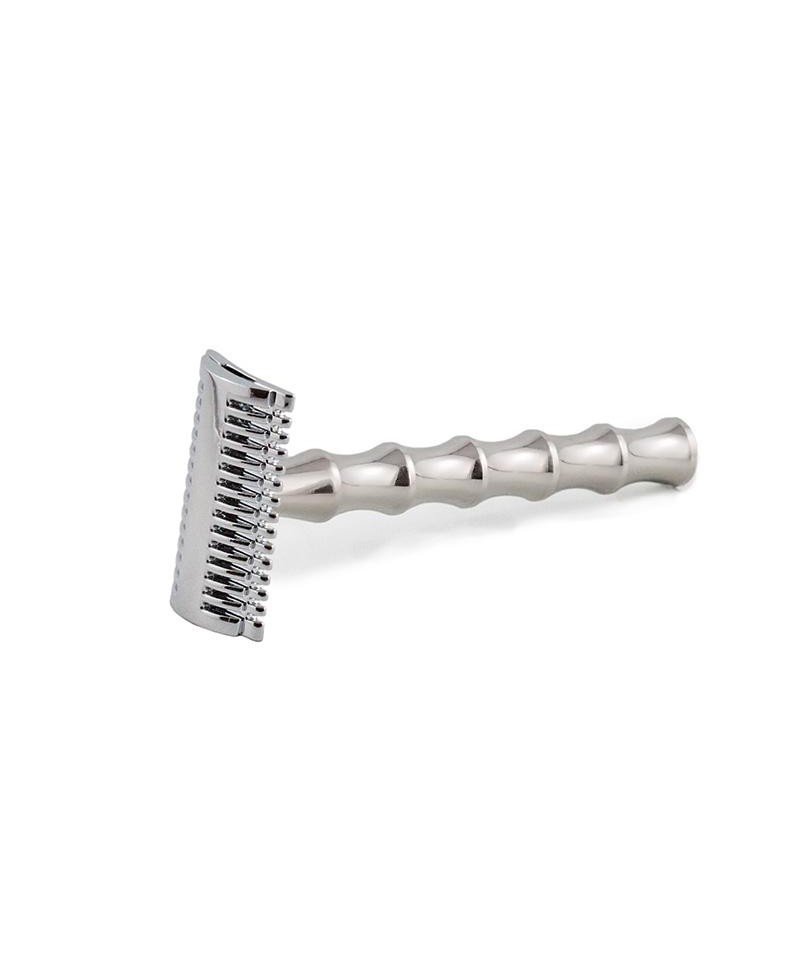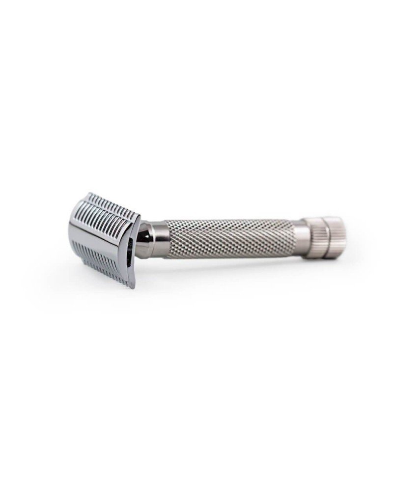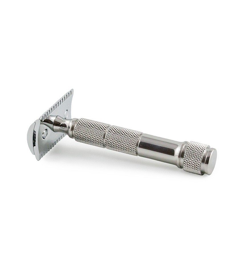 Questo design consente di trattenere una quantità extra di schiuma da barba tra i denti offrendo una maggiore lubrificazione ed un miglior scorrimento del rasoio sulla pelle. E’ così possibile passare più volte sullo stessa parte del viso con minori possibilità di irritazione. La testa dello SLOC  è in lega di aluminio zincata, il manico in solido acciaio inox Radio Knob, che termine con un pomello.