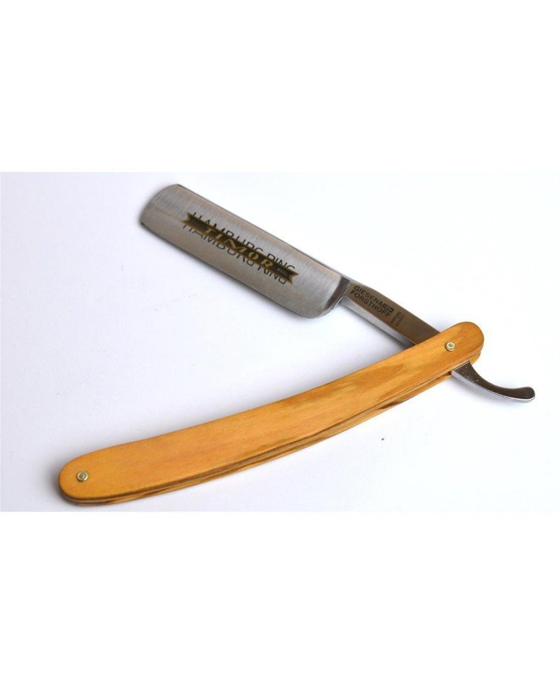 Rasoio a mano libera professionale di altissima qualità. Manico in legno d’ulivo e lama 6/8 in acciaio al carbonio. Incisione in oro Hamburg Ring. Affilatura concava